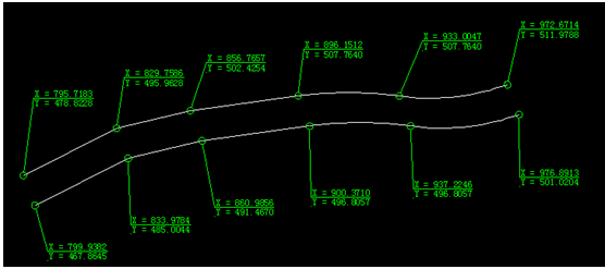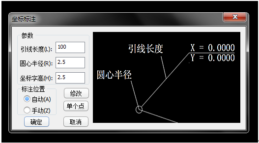 設計師能夠方便地在標注前設置引線長度,圓心半徑,坐標自高的參數設置。其中,標注方式分為手動與自動兩種。自動標注會一次性標注框選多段線每個夾點的坐標以相切45度于多段線的。手動標注可以調整坐標標注方向,引線長度以避免與其他標注碰撞。點擊對話框中的“修改”按鈕,則可以調整已標注的引線長度、方向。點擊“單個點”可以單獨標注多段線上任意點的坐標。