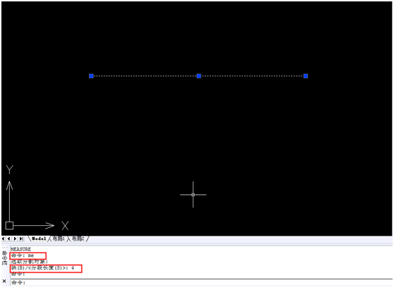 在CAD繪制一條直線——在命令行輸入me——選中要等分的直線——輸入等分距離(例如4)——回車——再次點擊等分的直線