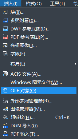 1.首先打開CAD軟件,點(diǎn)擊上方工具欄【插入】—【OLE對象】,如下圖所示: