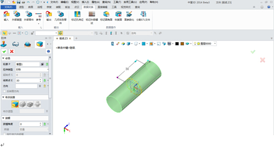 第一步,手柄繪制。選擇XY平面插入草圖,繪制一個直徑為20mm的圓,點擊退出,選擇拉伸選項,拉伸類型選擇對稱,結束點為30,點擊確定完成手柄的繪制,如下圖所示: