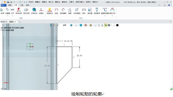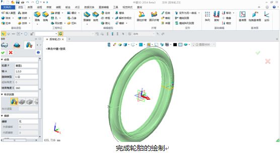 在這里要注意圓弧的繪制中位置的確定。完成草圖繪制后退出,選擇旋轉命令,完成輪胎的繪制,如下圖所示: