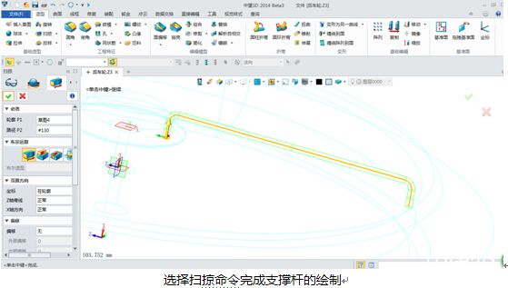 第三步,輪胎支撐桿的繪制。分別繪制支撐桿的輪廓和路徑草圖,然后選擇掃掠命令完成支撐桿的繪制,如下圖所示: