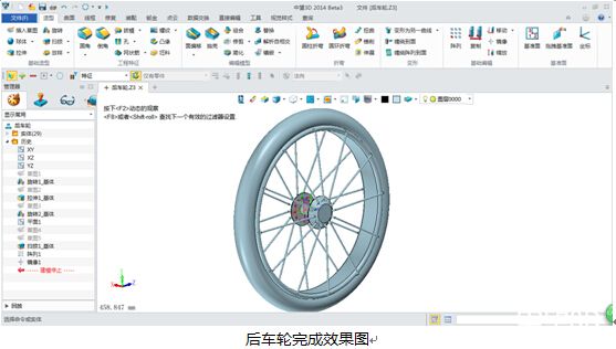該概念三輪車采用全綠色設計,看起來更加符合國家綠色節能環保的理念,另外它采用小輪設計,很適合在城市路面行駛,最重要的是它采用反三輪布局,前邊為兩個從動輪,后邊為驅動輪,看起來是否“高大上”呢,這就是我的創意——概念三輪車。很早以前就從報道中知道三維CAD軟件中望3D建模功能強大,操作界面簡單,因此用三維設計軟件中望3D進行我的創作過程,下面我就作為一個三維軟件設計老手,選擇概念三輪車后輪零件的車輪作為演示例子,為大家講解如何用三維CAD軟件中望3D快速建模設計: