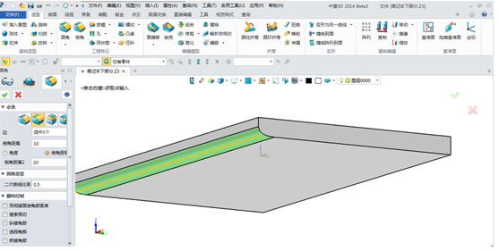 第二步,圓角處理。在造型圓角命令中,選擇橢圓圓角,選取基體底部邊,倒角距離10mm,倒角距離2為20mm,從而實現一邊兩個方向的倒圓角處理。如下圖所示: