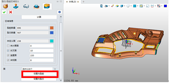 3.根據實際情況定義“豎直面”“交叉面”和“未知面”,這里全部定義為“型腔”區域,如圖: