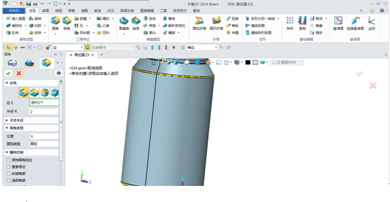 第二步,圓角處理。選擇可樂罐上下邊,半徑為2進(jìn)行圓角處理,如下圖所示: