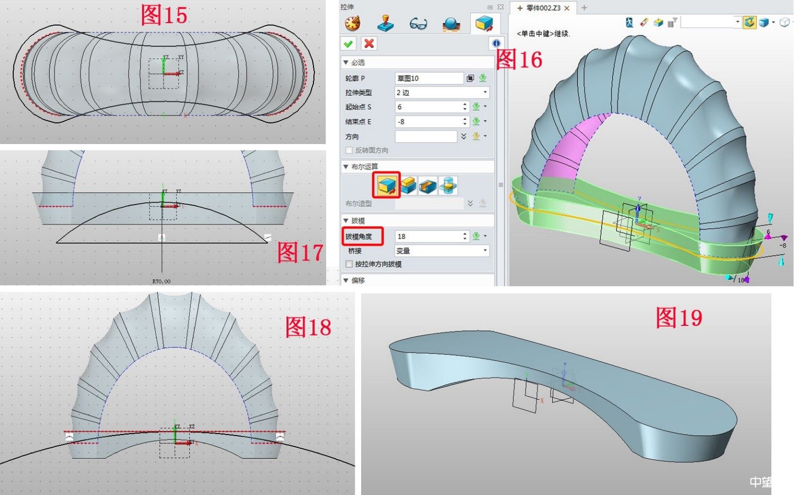 4、在XZ面插入草圖5,按圖11所示繪制11個弧線;在基準面1上插入草圖6繪制半圓弧,即步驟1圖2中的半圓弧,注意按圖12所示修剪到多余的部分;退出草圖后將草圖6鏡像到另一側,如圖13所示;點擊U/V曲線,按照圖14所示修補曲面,同理修補剩余的所有曲面。