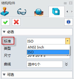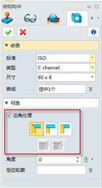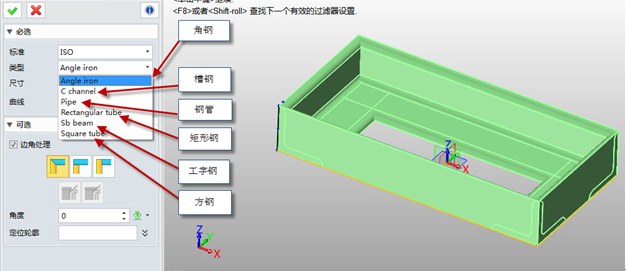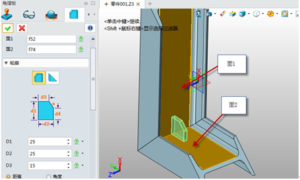 下面我們介紹如何創建角撐板,首先點擊“角撐板”命令,選擇需要創建的面1以及面2,可以選擇輪廓類型,以及設置需要的尺寸大小。