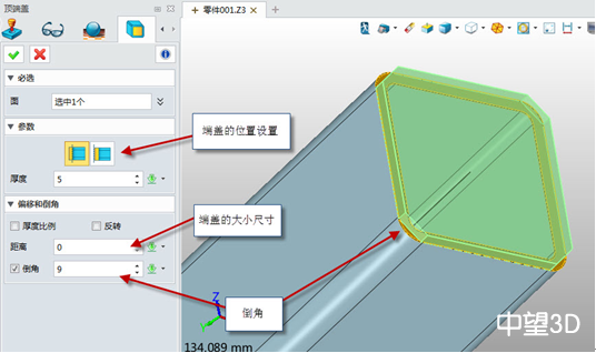 頂端蓋功能是在封閉的區域斷面生成一個蓋子,并且這個蓋的大小尺寸,以及厚度都可以隨時修改,并且我們可以調接倒角大小。