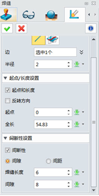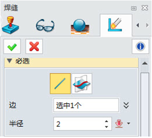 焊縫功能是為是在幾個構造之間創建焊縫造型。點擊焊縫功能,我們可以選擇焊接邊,也可以通過相交間接的創建焊接邊,也可以選擇焊縫的半徑。